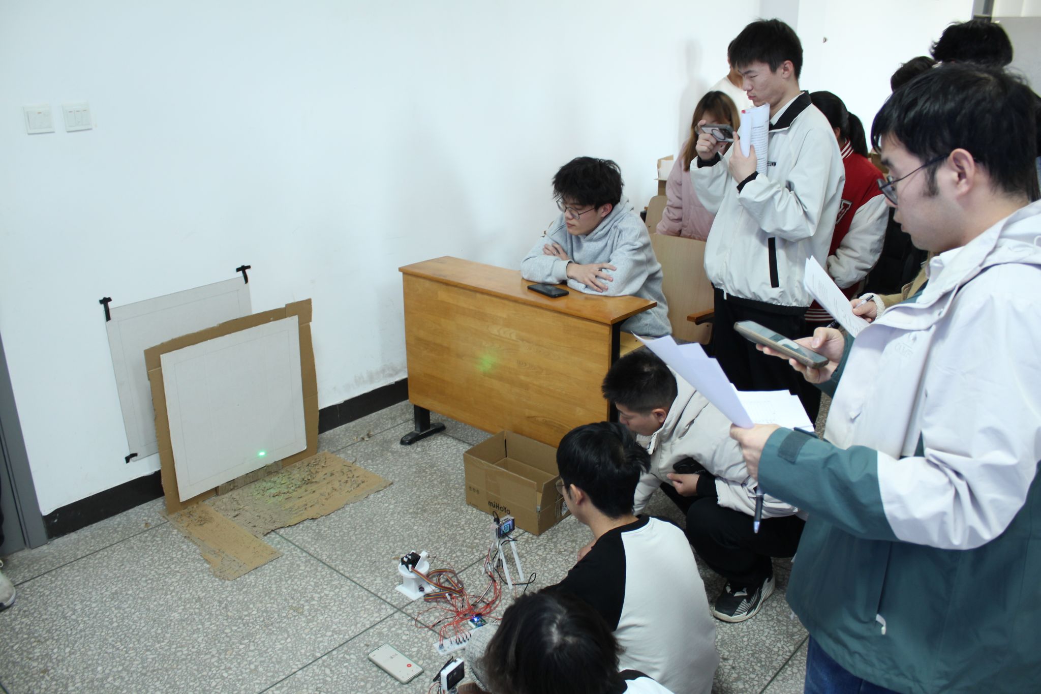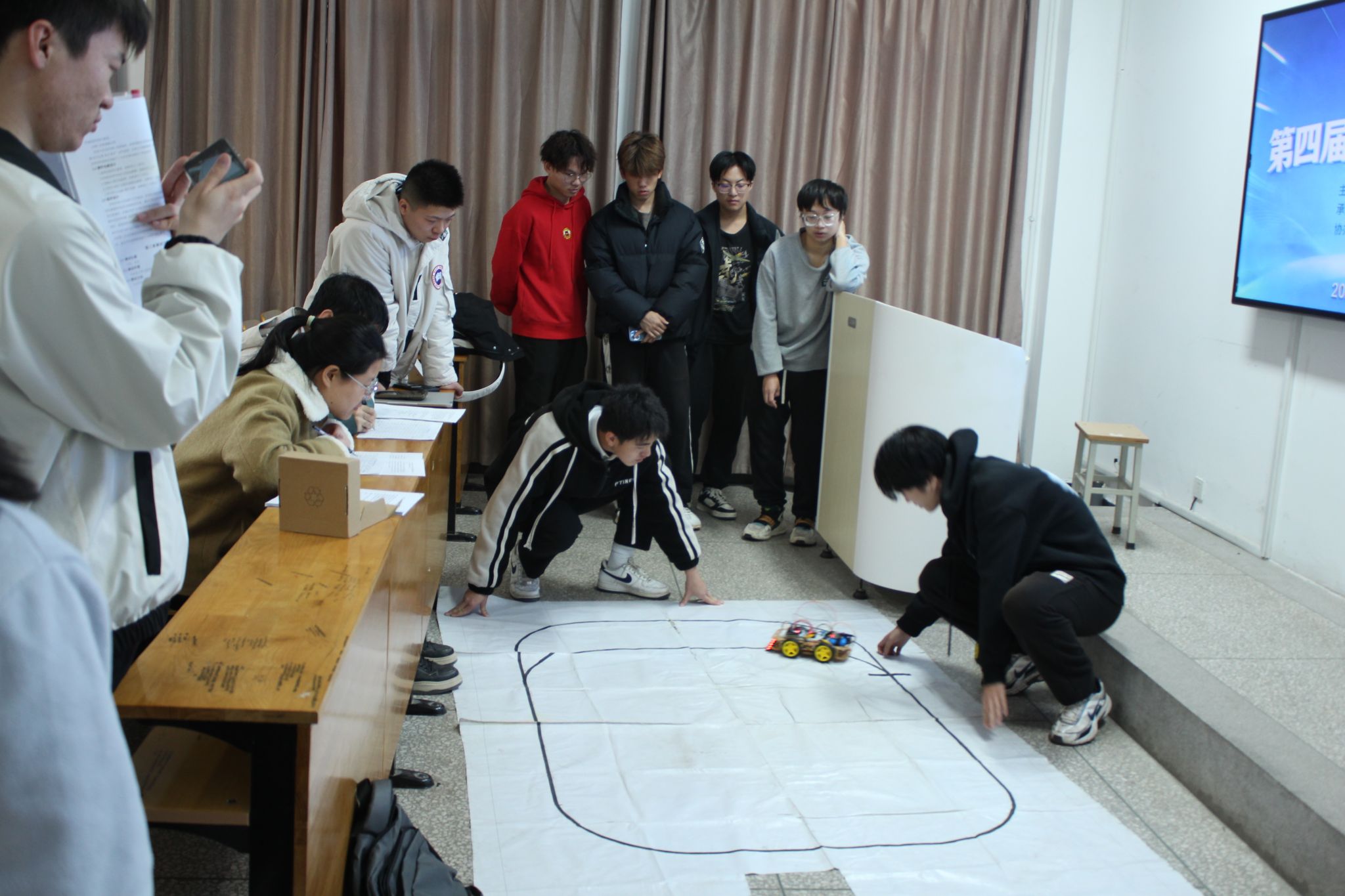 比赛现场,各参赛队伍依次阐述了作品的设计思路与工作原理,并围绕内圈小车超车领跑、光斑实时追踪、小车远距离往返送货、指定路径循环行驶等任务进行了生动的功能演示。同学们充分发挥专业特长,完整经历了理论分析、电路与程序设计、成果测试等环节,展现出扎实的实践能力与良好的团队协作精神。评委依据作品的完成度、创新性及现场展示效果等维度进行提问,并综合评定成绩。最终,竞赛共评选出一等奖5项、二等奖8项、三等奖9项,获奖名单见附件。