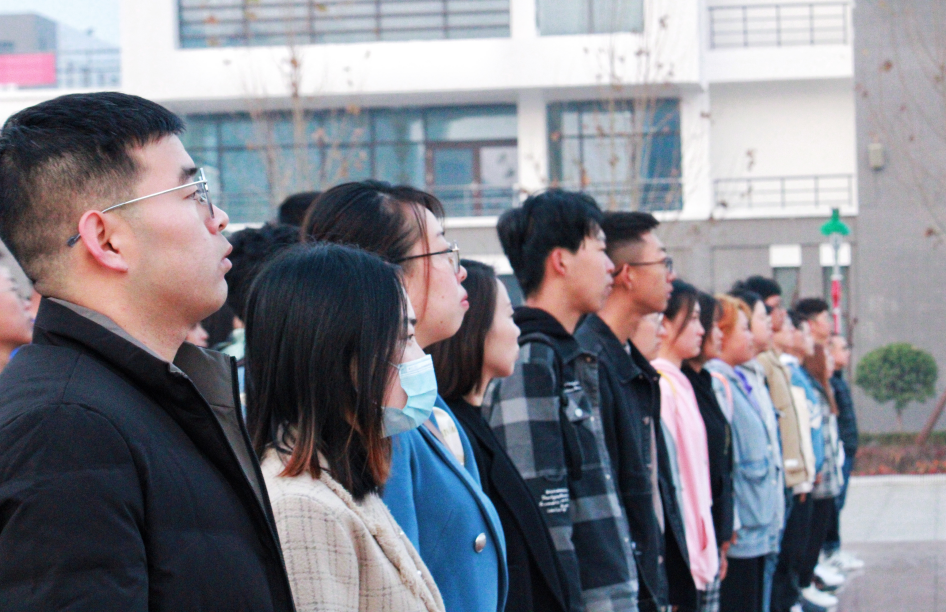 国旗护卫队队员昂首挺胸、精神抖擞,迈着整齐有力的步伐走向升旗台,国歌奏响,五星红旗冉冉升起。全体人员整齐肃立,高唱国歌,面向鲜红的五星红旗行注目礼。