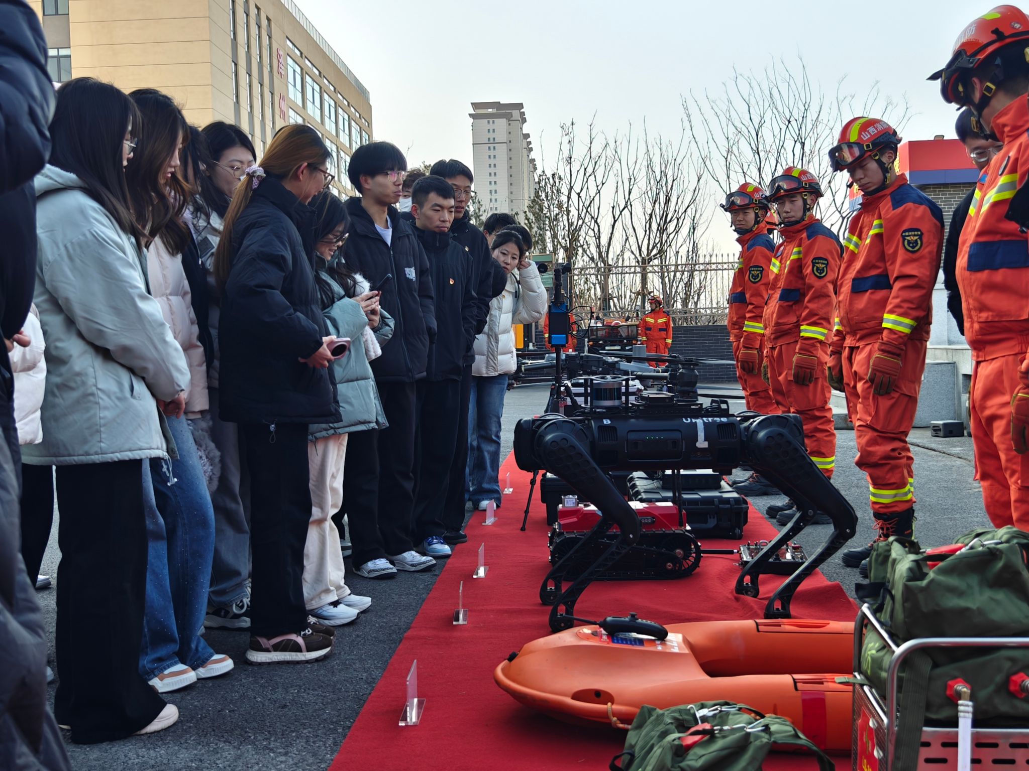活动现场,师生党员首先参观了消防装备展示区。消防员结合实战案例,详细讲解装备功能原理、操作规范与适用场景,现场演示了消防机械狗与各类现代化灭火装置,直观展现智能装备在火情侦察、高危环境作业等场景的实战应用。通过近距离接触消防装备,大家真切体会到消防救援工作的严谨与不易,认识到科技赋能对提升救援效率、保障人员安全的重要意义。随后,消防员聚焦校园宿舍、实验室等火灾高发场景,开展专题宣讲,剖析典型案例,系统讲解火灾预防、灭火器使用及火场逃生等知识,强调日常安全细节的重要性,为筑牢平安校园防线打下坚实基础。